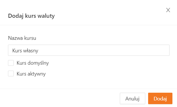 Jeśli potrzebujesz własnej listy kursów (np. do przełączania się między różnymi zestawami przeliczników), możesz dodać nowy kurs. Na liście kursów kliknij +Dodaj, uzupełnij nazwę oraz (opcjonalnie) zaznacz, czy kurs ma być aktywny i/lub domyślny, a następnie kliknij Dodaj.