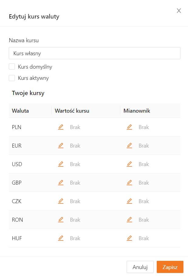 Po dodaniu kursu xSale wyświetli jego szczegółowe ustawienia — listę walut zdefiniowanych w systemie oraz formularz do wprowadzenia wartości kursu dla poszczególnych walut. Kliknij ikonę ołówka, aby ustawić wartości.