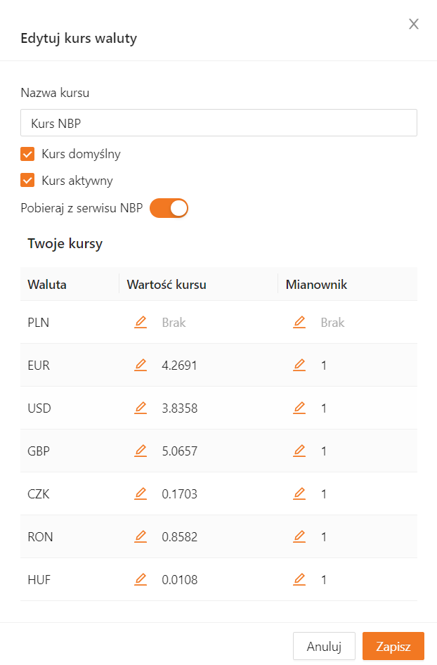 Aby włączyć cykliczną aktualizację, w pierwszym wpisie na liście zaznacz opcję Pobieraj z serwisu NBP, a następnie zapisz zmiany przyciskiem Zapisz.