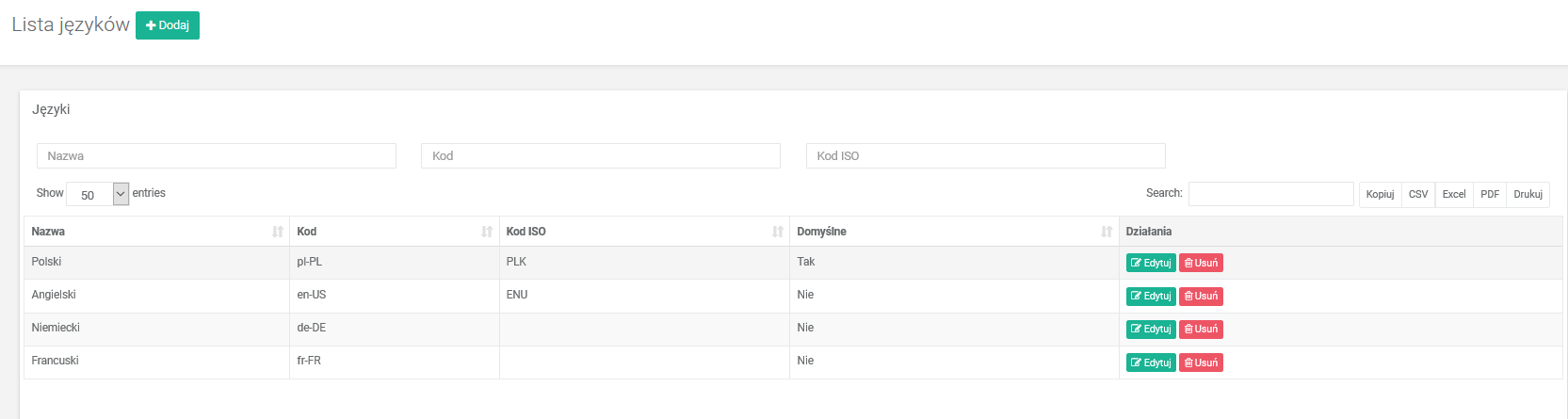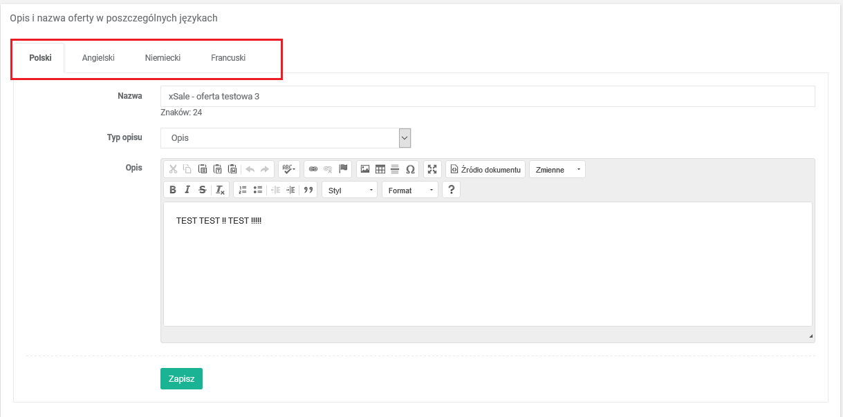 W tym miejscu możesz skonfigurować języki dostępne na ofertach. Do kanału sprzedaży można przypisać domyślny język, dzięki czemu podczas wystawiania oferty na ten kanał nazwa i opis będą pobierane z odpowiedniej zakładki językowej.