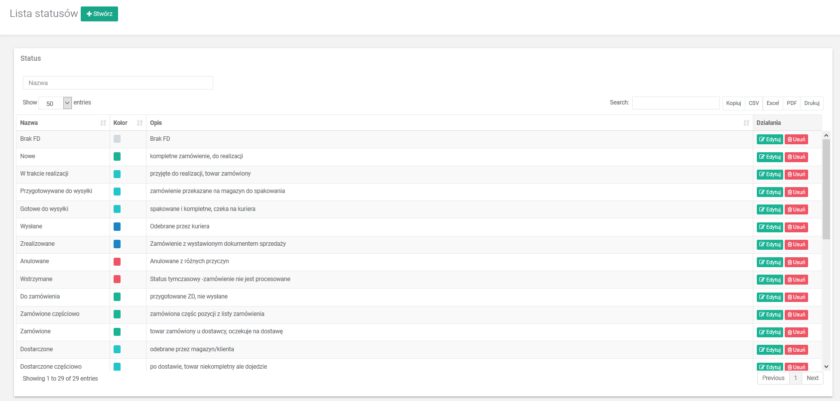 Zakładka Statusy zawiera listę statusów dostępnych na dokumentach w xSale.