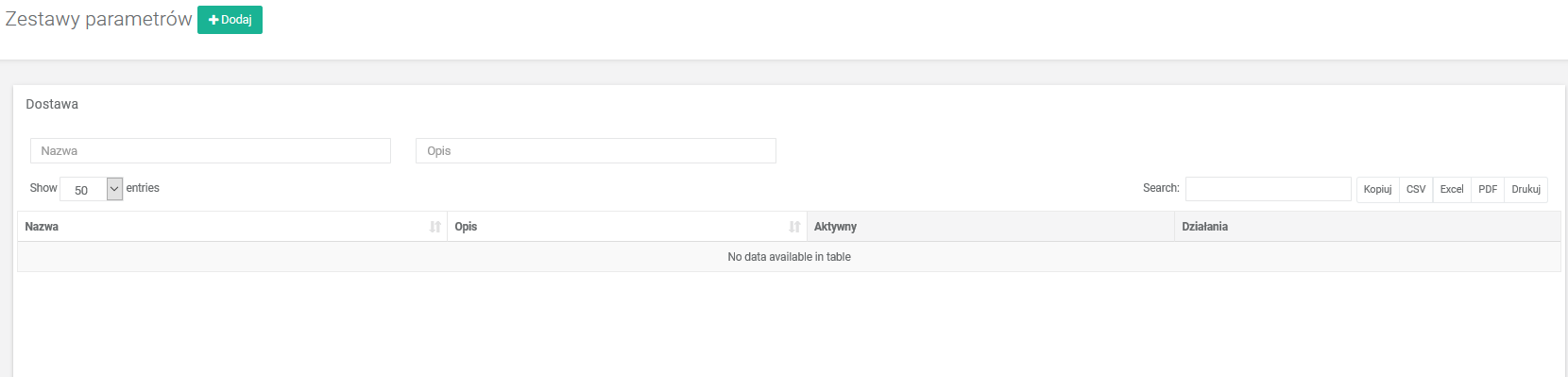 W celu dodania zestawu parametrów przejdź do Konfiguracja -> Zestawy parametrów i kliknij przycisk +Dodaj.