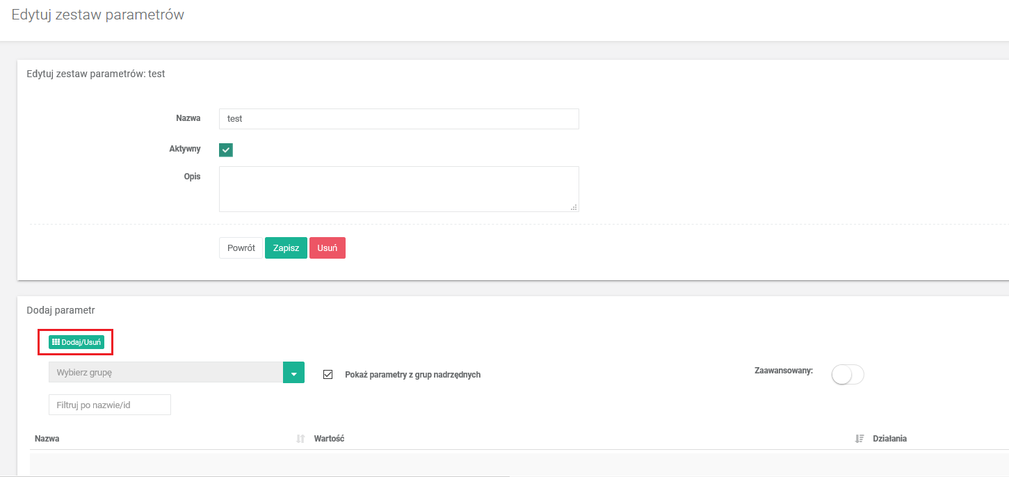 Następnie wpisz nazwę zestawu i kliknij Dodaj. Po zapisaniu pojawi się sekcja Dodaj parametr oraz przycisk Dodaj/usuń, za pomocą którego możesz przypisać parametry do zestawu i ustawić ich wartości.