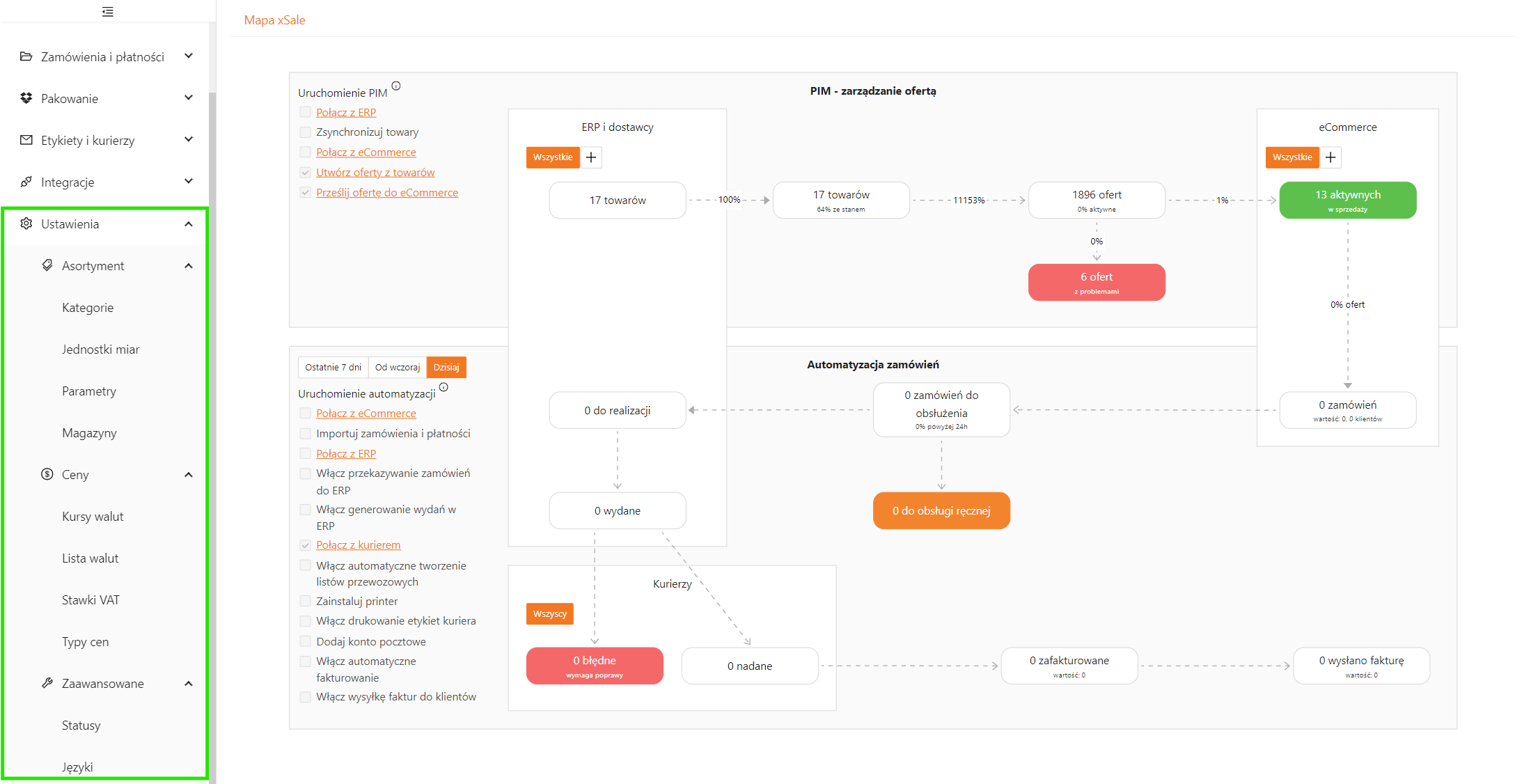 Większość ustawień dotyczących konfiguracji xSale jest dostępna w nowym interfejsie systemu, w sekcji Ustawienia. To właśnie tam znajdziesz najważniejsze widoki związane z asortymentem, cenami, integracjami i ustawieniami zaawansowanymi.