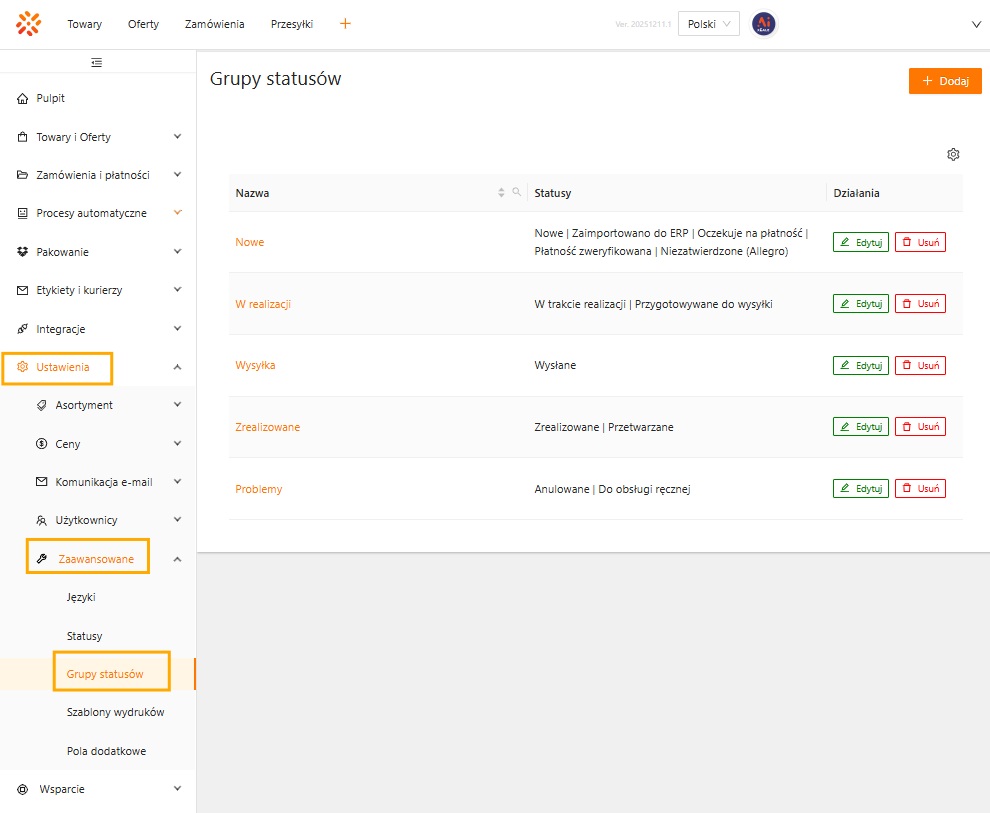 Aby zarządzać grupami statusów, przejdź do sekcji Ustawienia -> Zaawansowane -> Grupy statusów. Z tego poziomu możesz dodawać nowe grupy, edytować istniejące i usuwać te, które nie są już potrzebne.