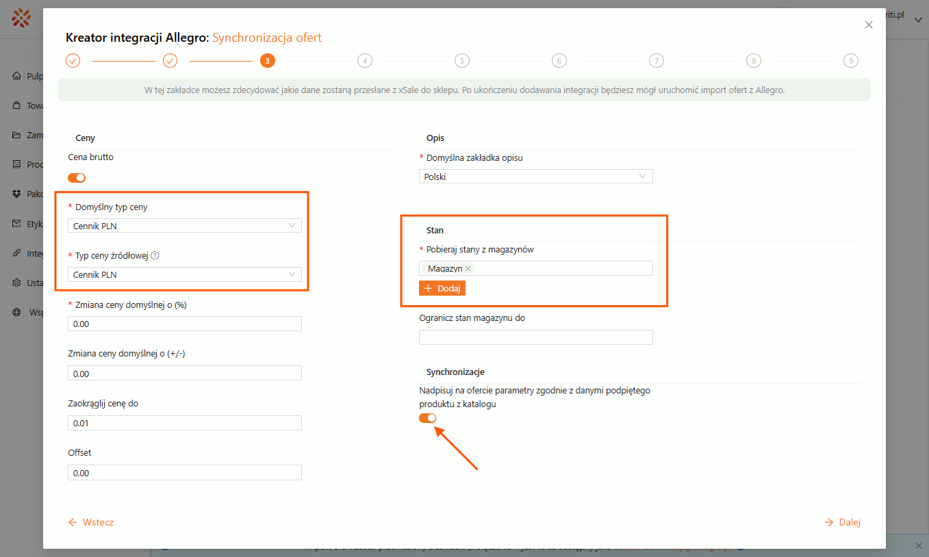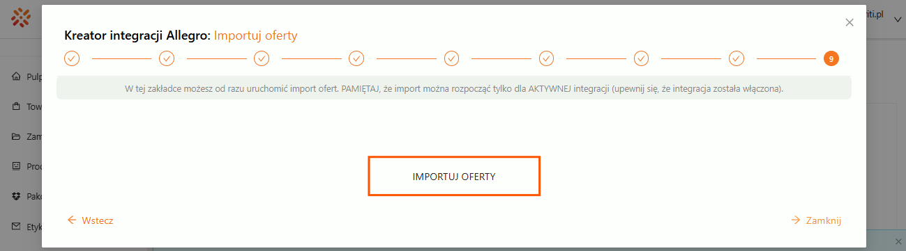 Poniżej przykład pełnego przejścia kreatora integracji Allegro. Ekrany pokazują kolejne kroki w takiej kolejności, w jakiej zobaczysz je w systemie.