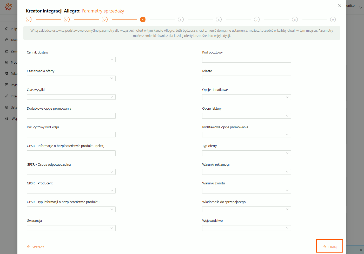 Krok 7. Parametry sprzedaży (głównie GPSR) można na tym etapie pominąć — później będzie możliwość ich uzupełnienia. |