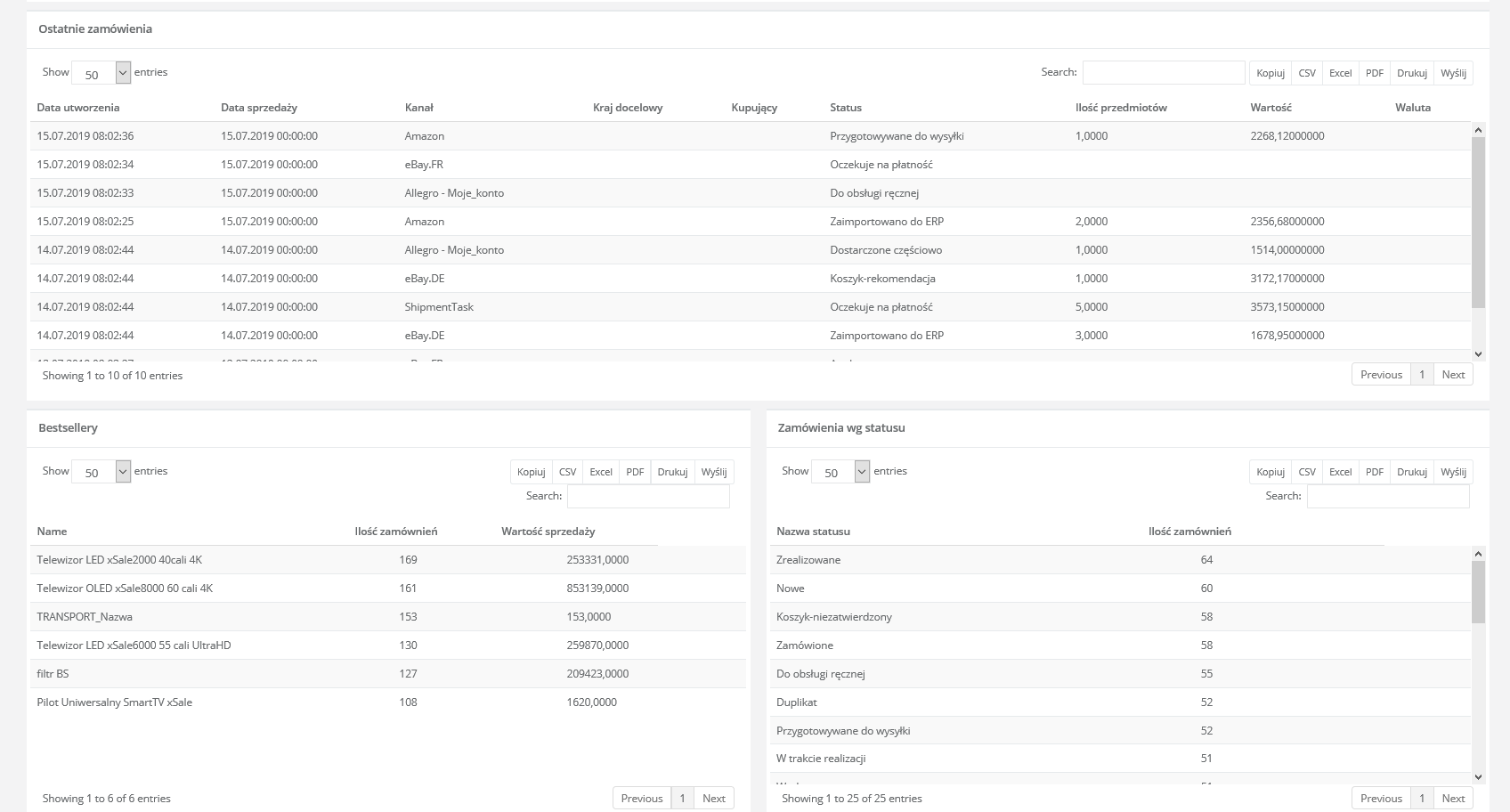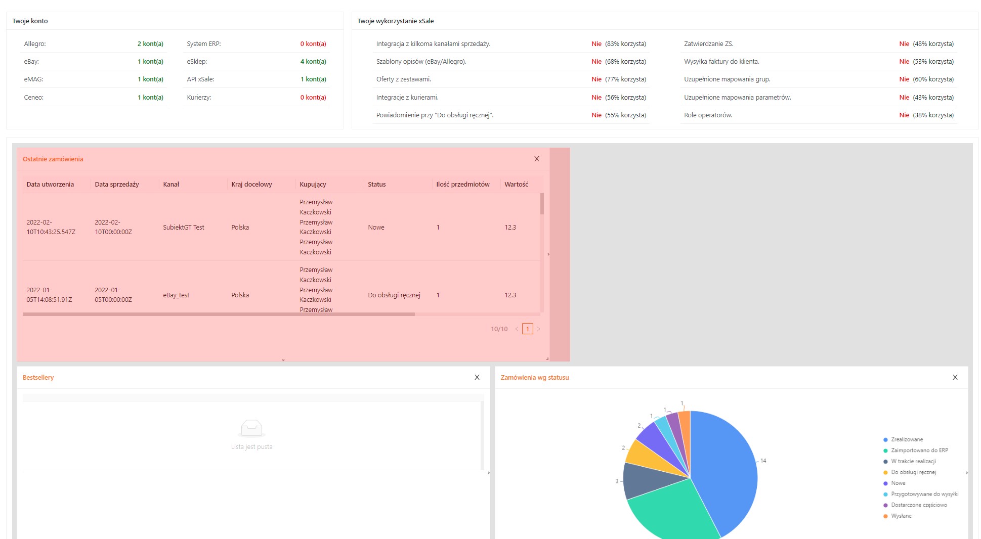 W standardowym układzie strony głównej znajdują się raporty takie jak Ostatnie zamówienia, Bestsellery, Zamówienia wg statusu, Ilość ofert według kanałów, Oferty z problemami (TOP100).