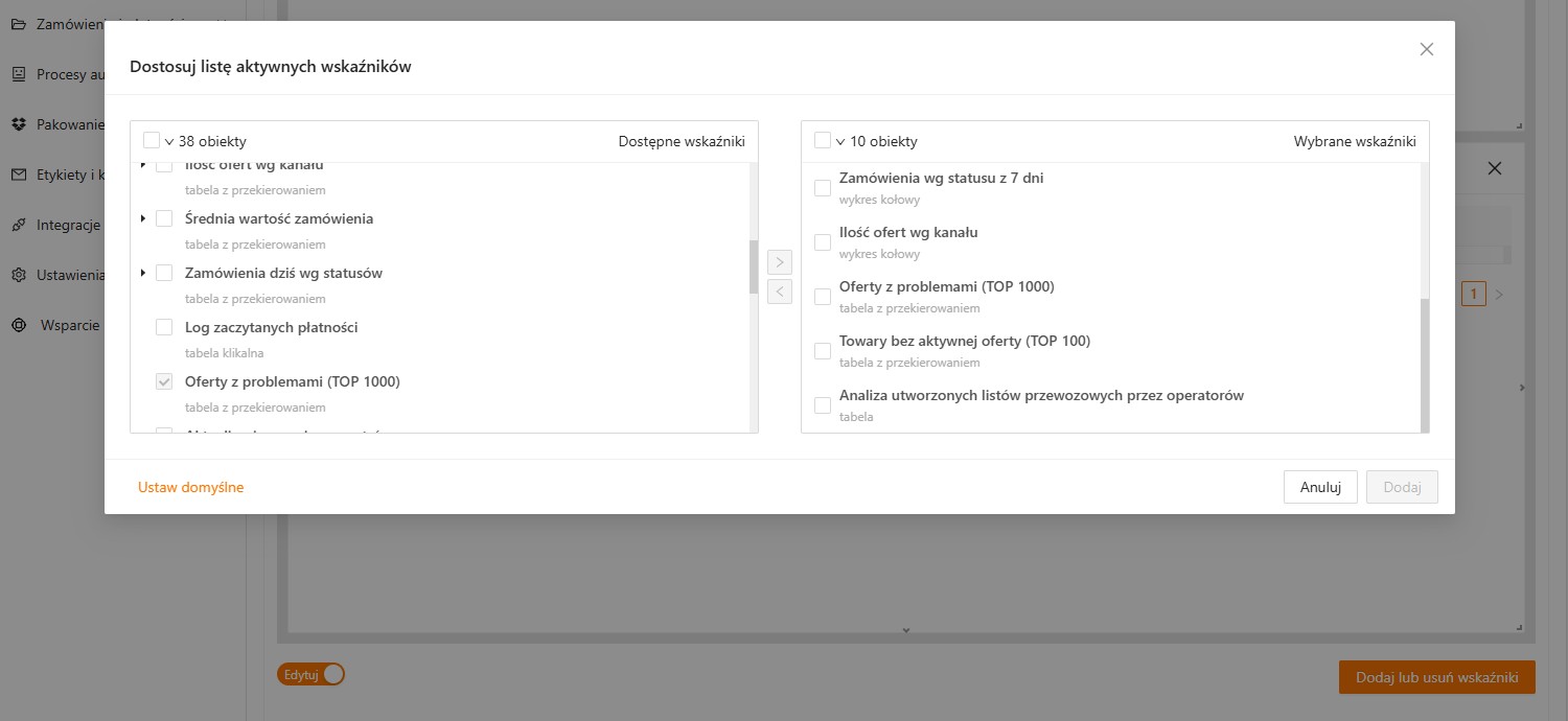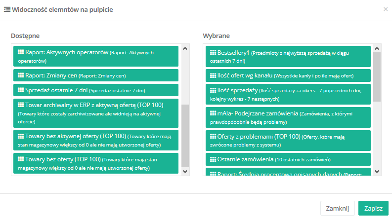 Wchodząc w ustawienia układu strony (Ustawienia –> Układ strony –> ikona trybików w prawym dolnym rogu) można wybrać dodatkowo inne Raporty na stronę główną np. Towar archiwalny w ERP z aktywną ofertą (TOP100), Towary bez aktywnej oferty (TOP100). Na podanej liście należy przeciągnąć żądany raport z lewej strony ( Dostępne) na prawą stronę (Wybrane).