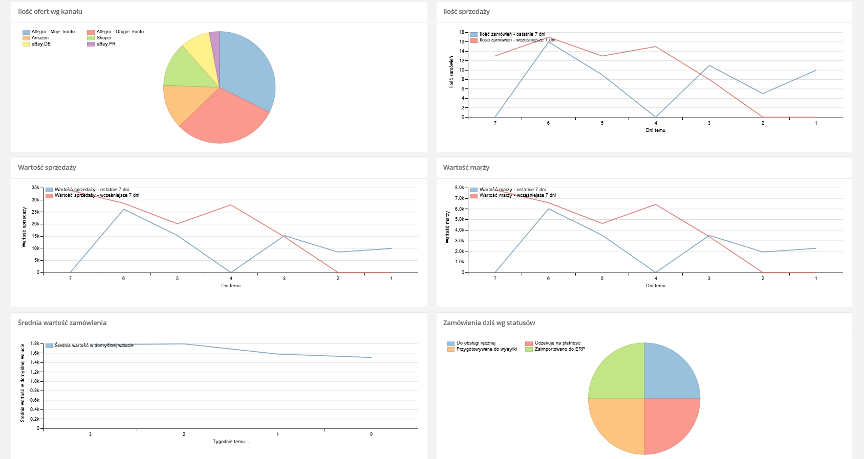 Strona główna zawiera także wskaźniki np. Ilość ofert według kanału, Ilość sprzedaży, Wartość sprzedaży, Wartość marży, Średnia wartość zamówienia, Zamówienia dziś wg statusu.