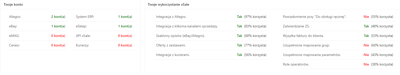 Na stronie głównej znajduje się wskaźnik wykorzystania xSale. Pokazuje on m.in. ilość aktywnych kont Allegro, eBay, eMag, Ceneo. Jeśli nie posiadasz jeszcze integracji z jednym z tych kont możesz w łatwy sposób je dodać. Wystarczy kliknąć w informację „0 kont(a)”. Link przeniesie Cię do kreatora nowej integracji.