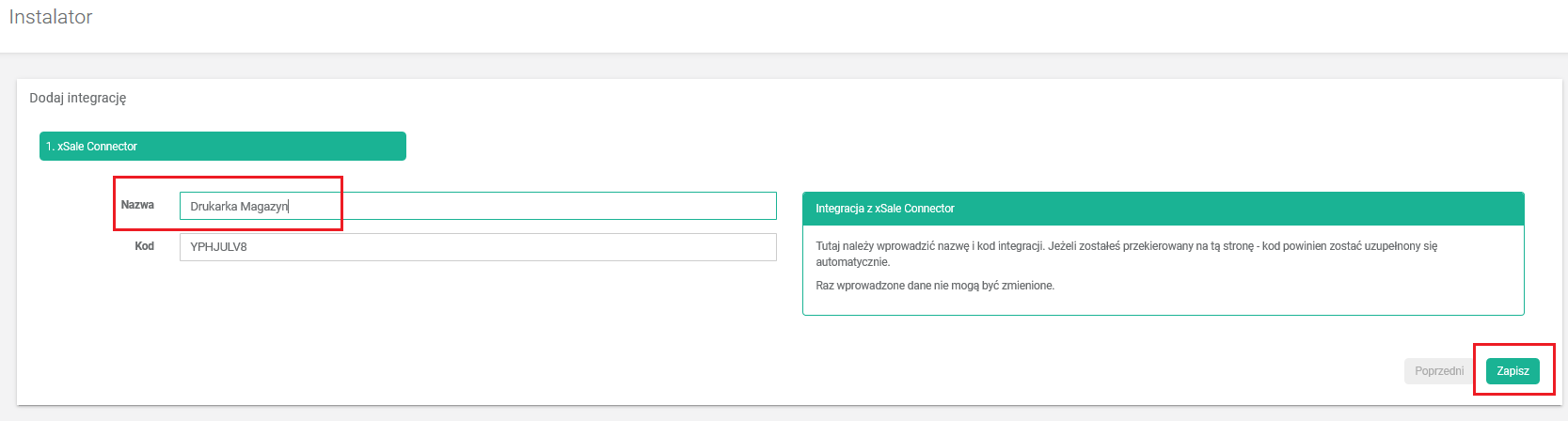 W xSale należy podać nazwę dla integracji z drukarką i kliknąć Zapisz.