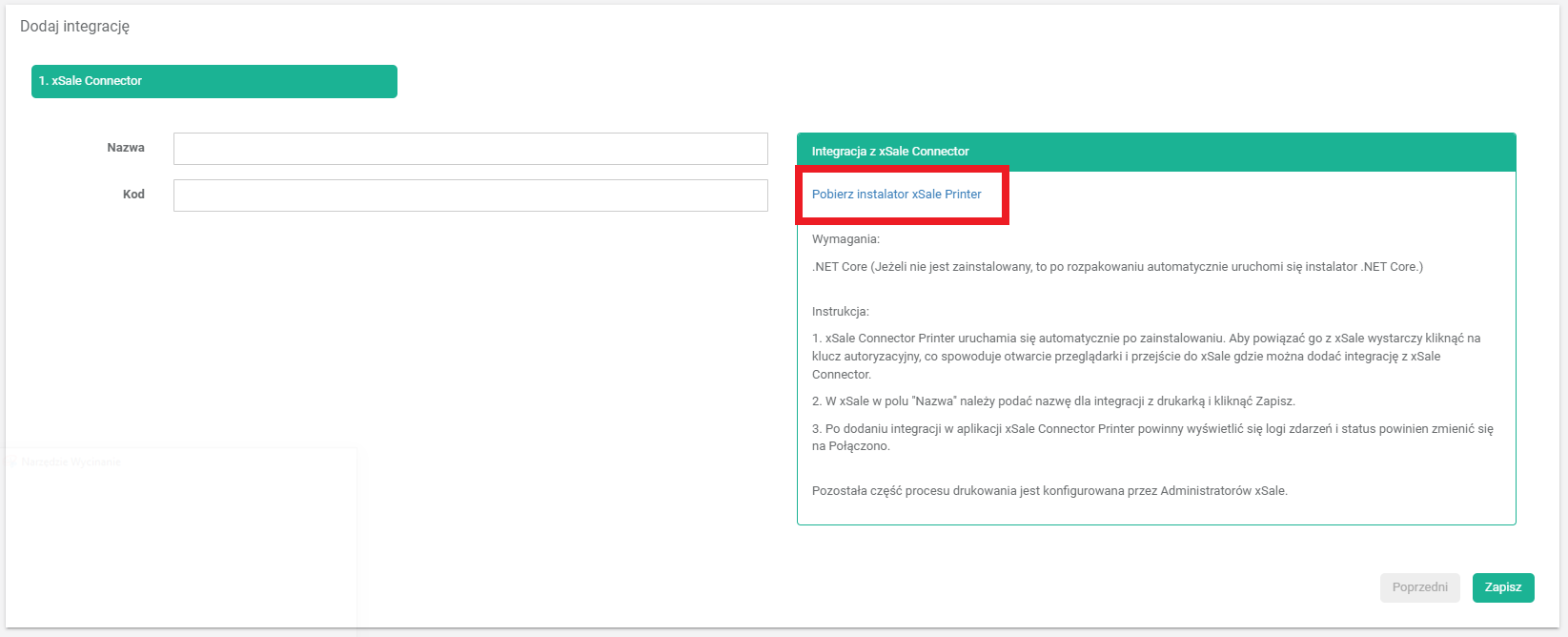 Po dodaniu integracji można pobrać instalator aplikacji xSale Connector Printer.