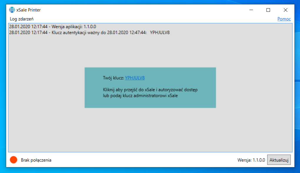 xSale Connector Printer uruchamia się automatycznie po zainstalowaniu. Aby powiązać go z xSale wystarczy kliknąć na klucz autoryzacyjny, co spowoduje otwarcie przeglądarki i przejście do xSale gdzie można dodać integrację z xSale Connector.