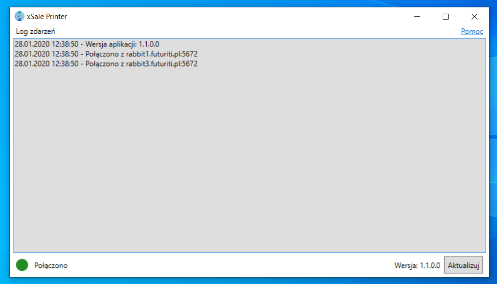 Po dodaniu integracji w aplikacji xSale Connector Printer powinny wyświetlić się logi zdarzeń i status powinien zmienić się na Połączono.