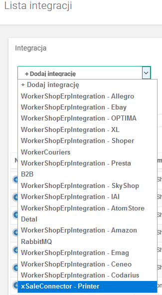 Aby dodać integrację z xSale Connector Printer przejdź do Konfiguracja –> Ogólne–> Integracje kliknij przycisk +Dodaj integrację i z listy wybierz xSale Connector – Printer.