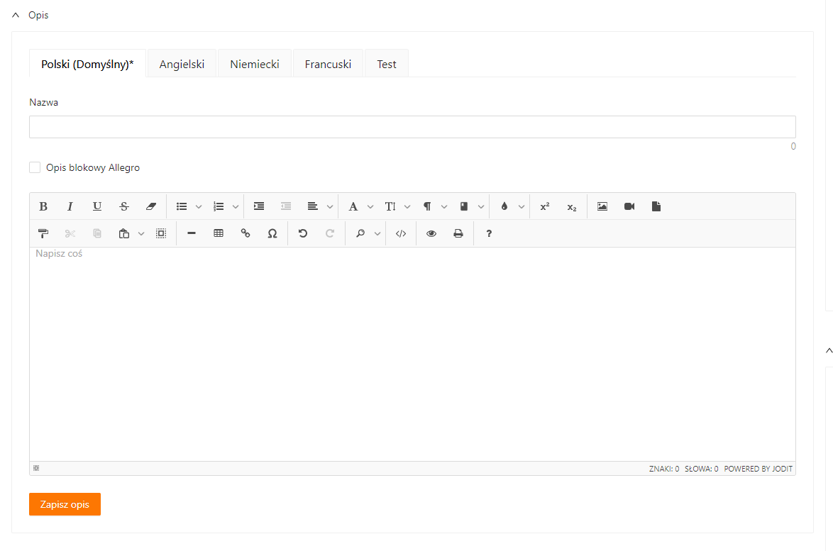 Umożliwia edycję opisu z użyciem popularnych funkcji i kodu HTML.