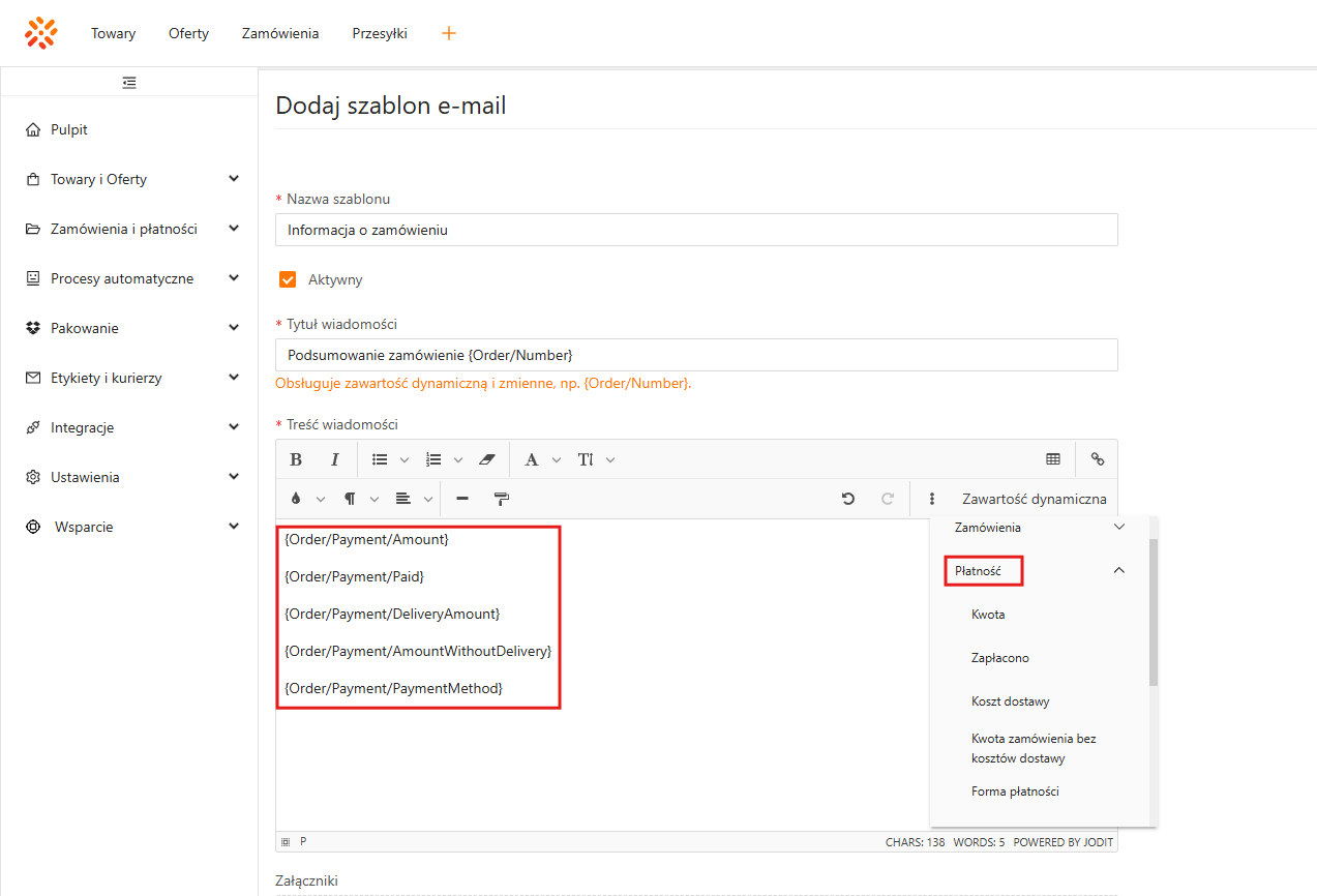 Znaczniki z tej sekcji pozwalają automatycznie uzupełnić wiadomość o dane związane z płatnością za zamówienie.
