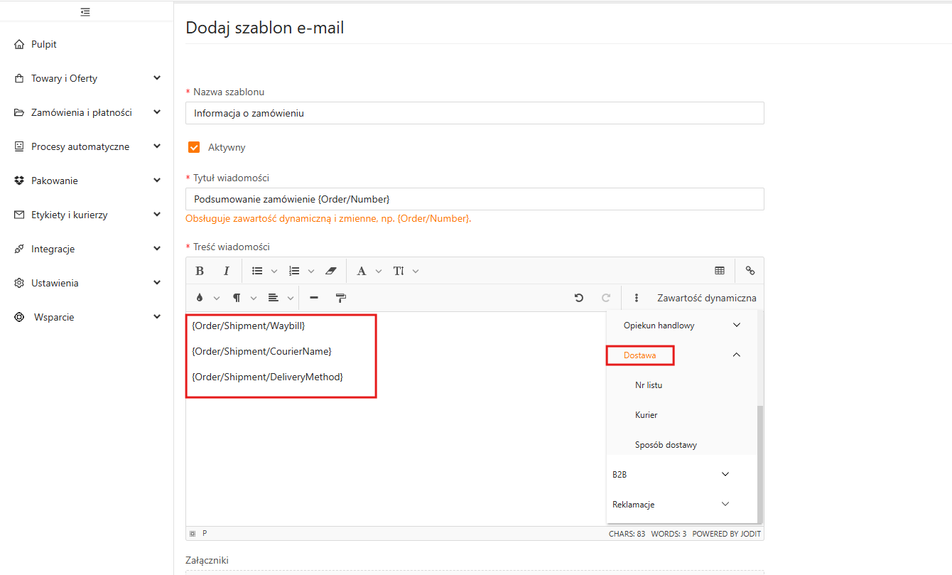 Znaczniki z sekcji dostawy pozwalają automatycznie wstawić do wiadomości informacje o realizacji przesyłki, takie jak numer listu przewozowego, nazwa kuriera i wybrany sposób dostawy.