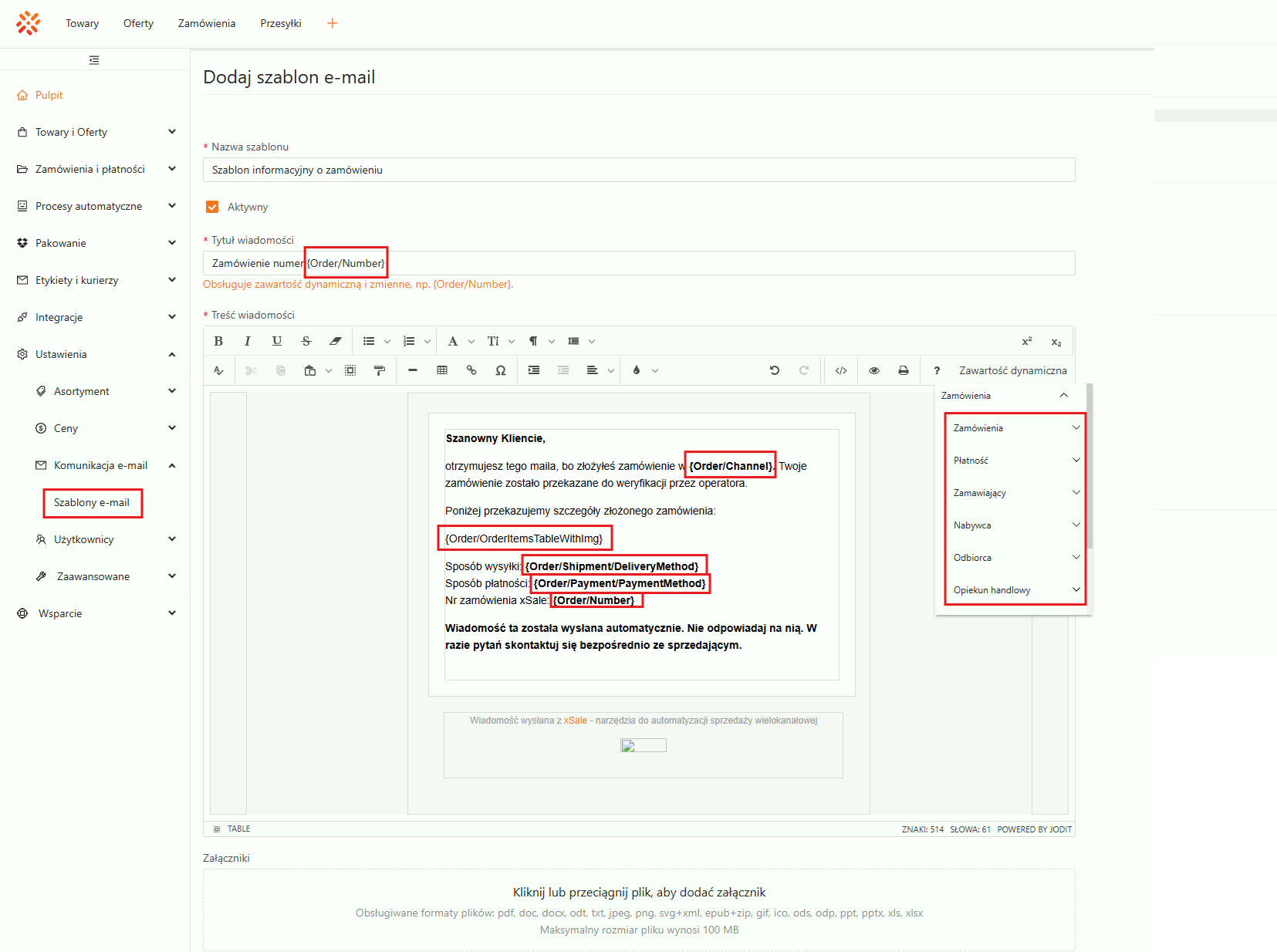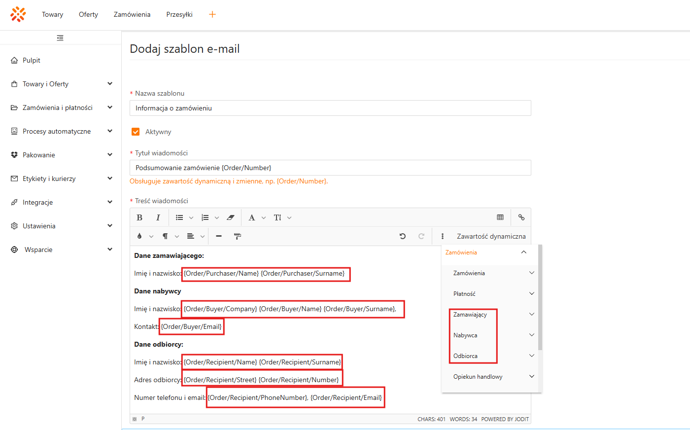 W szablonach wiadomości możesz korzystać z Zawartości dynamicznej, czyli znaczników wstawiających do treści dane pobrane bezpośrednio z systemu. Dzięki temu wiadomość może automatycznie zawierać na przykład numer zamówienia, dane klienta, formę płatności albo numer listu przewozowego.