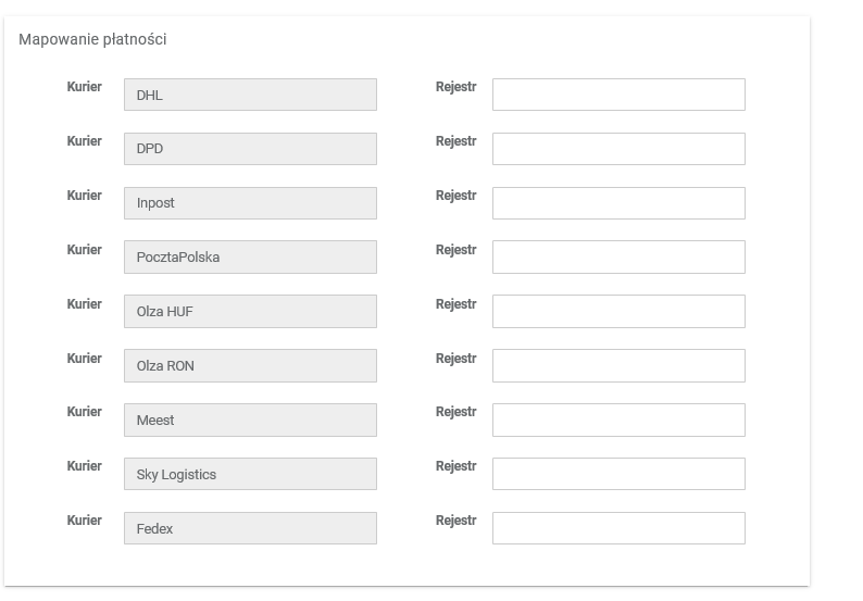 - W sekcji Mapowanie płatności wpisz akronim rejestru dla każdego kuriera.
