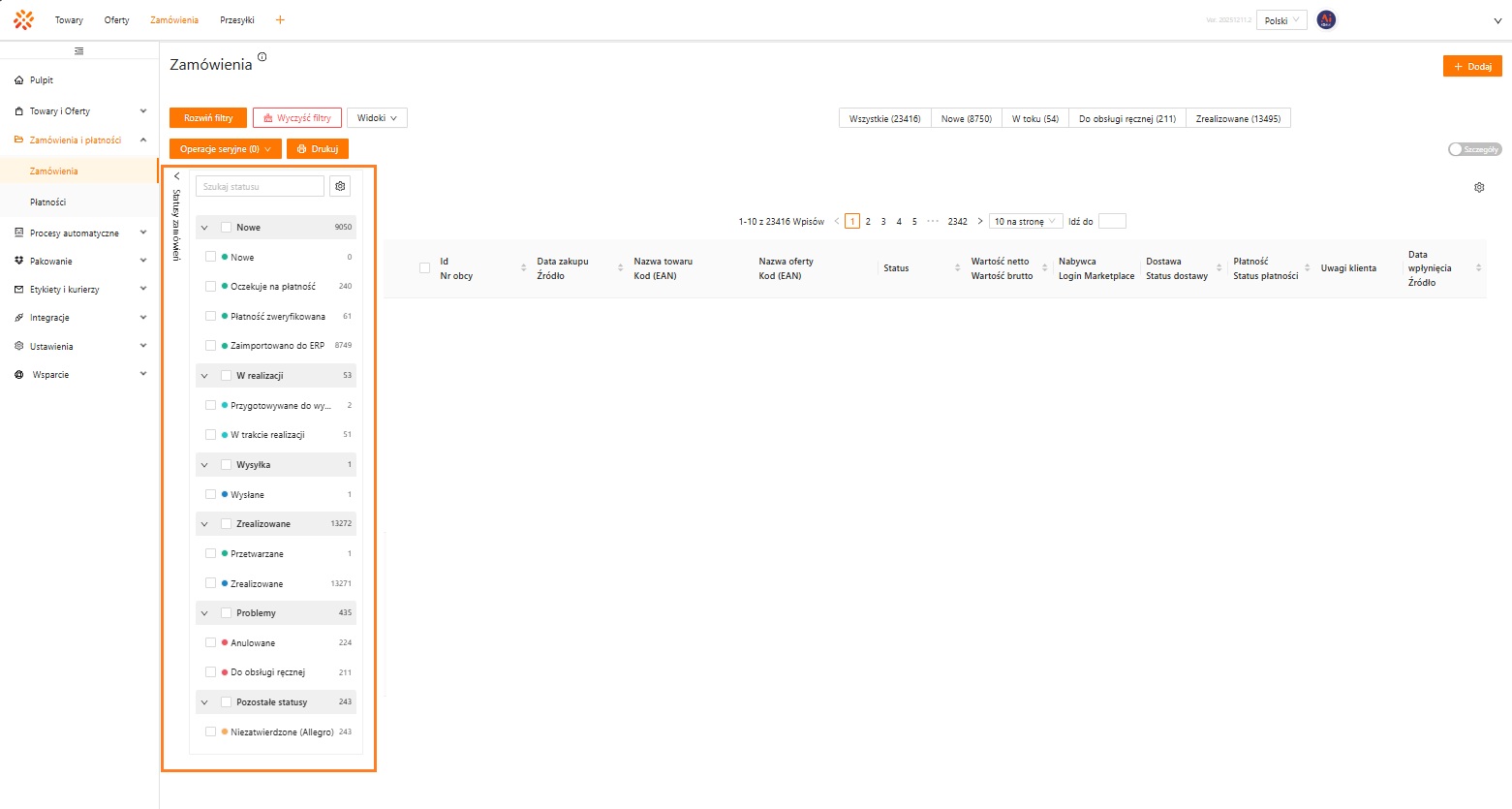 Kliknięcie statusu filtruje listę zamówień do wybranego stanu. Możesz zaznaczyć wiele statusów jednocześnie, a także filtrować całą grupę statusów.