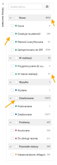 Przy nazwie każdego statusu znajduje się liczba będąca sumą zamówień w danym statusie. Przy nazwie grupy statusów widać sumę wszystkich zamówień o statusach przypisanych do tej grupy.