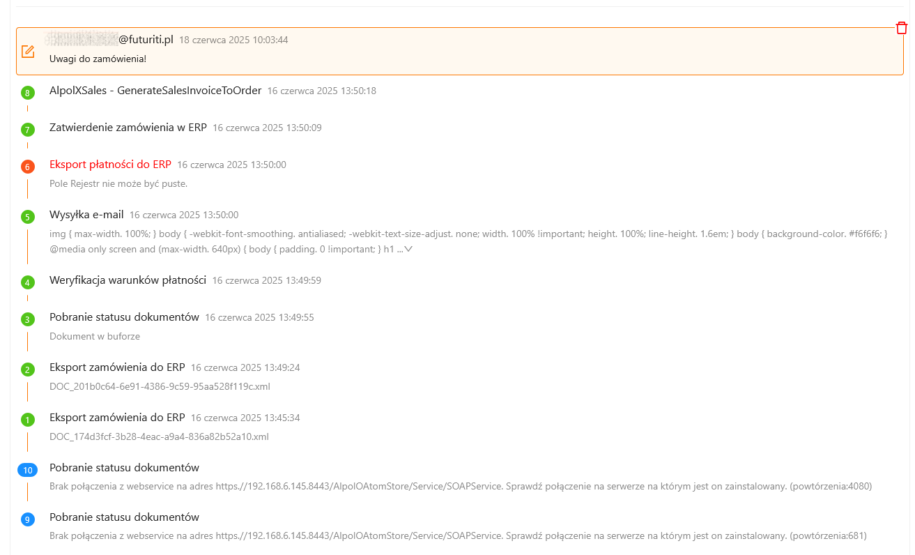 Wpisy w historii zawierają informacje o dacie i czasie realizacji zadania oraz szczegóły dotyczące zrealizowanych procesów. Dzięki temu można przeglądać poszczególne etapy realizacji zamówienia oraz weryfikować ewentualne błędy lub przestoje.