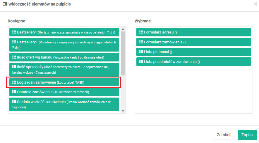 Następnie przenieś do elementów widocznych sekcję Log zadań zamówienia, nadaj jej nazwę i ustaw typ, np. tabela klikalna.