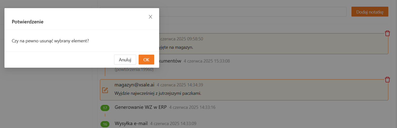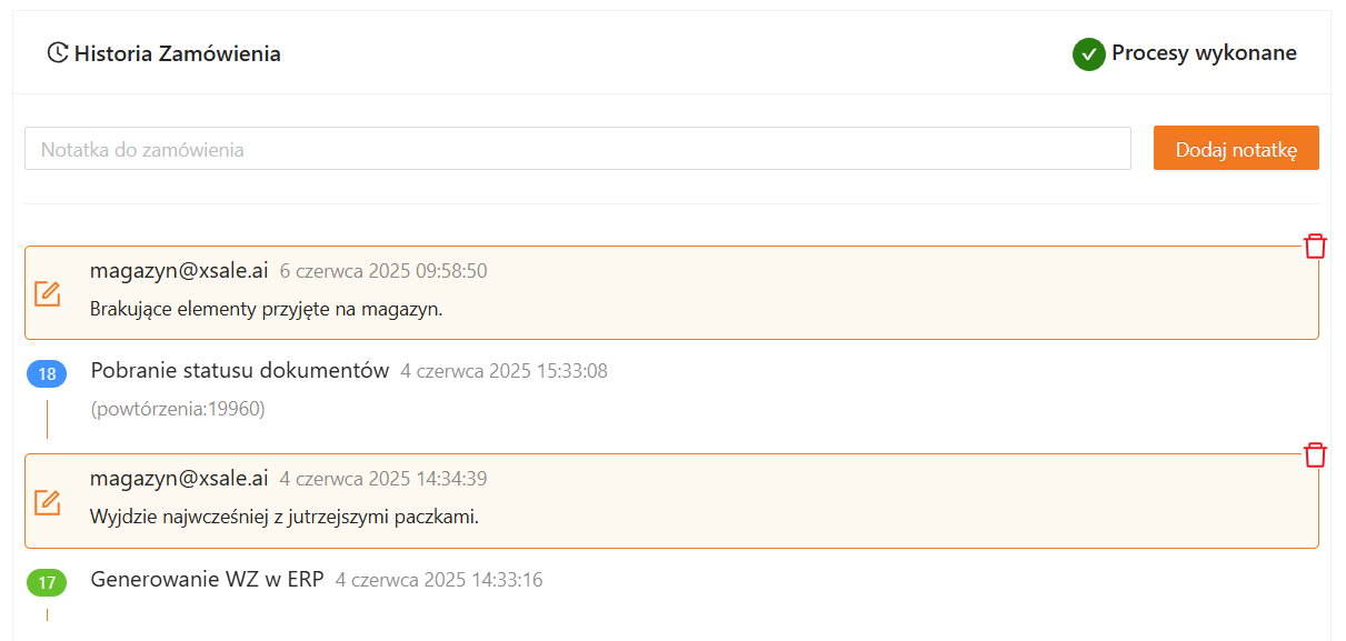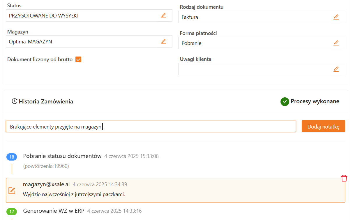 Dodane notatki wyświetlane są razem z logami historii zamówienia, w kolejności chronologicznej. Dzięki temu możesz w jednym miejscu śledzić zarówno działania systemu, jak i ustalenia zapisane przez zespół.