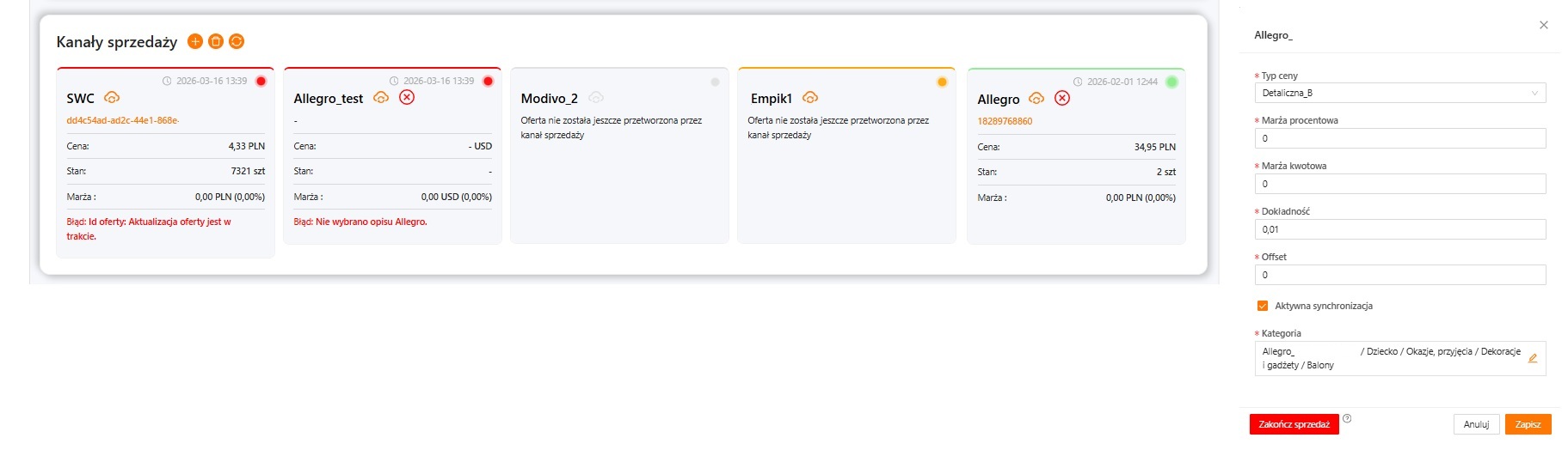 Po wejściu w wybrany kanał możesz edytować jego ustawienia, takie jak typ ceny, marża, offset czy aktywność synchronizacji. W zależności od kanału i typu oferty możesz też wskazać kategorię sprzedażową.