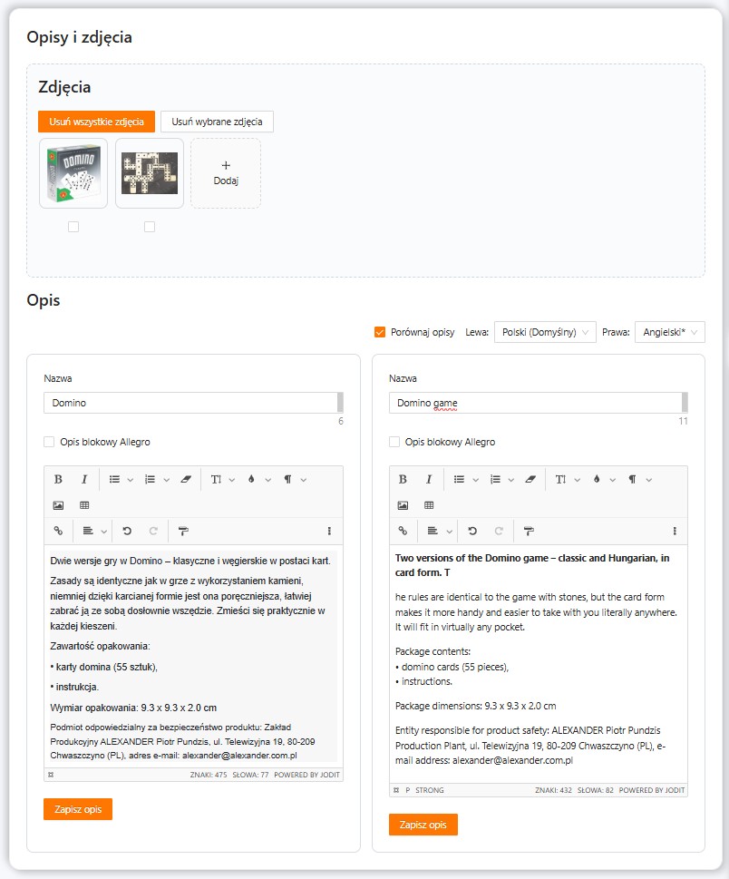 Jeżeli oferta ma wiele wersji językowych, możesz przełączać się między nimi i edytować zawartość osobno dla każdego języka. W tej samej sekcji dodajesz także zdjęcia, zmieniasz ich kolejność i kontrolujesz, ile zdjęć jest aktualnie przypisanych do oferty.
