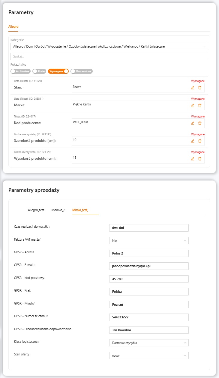 Sekcja Parametry pokazuje parametry przypisane do oferty na kanałach sprzedaży. Jeżeli oferta ma kilka kanałów, możesz przeglądać parametry dla poszczególnych konfiguracji i sprawdzać, które z nich są już uzupełnione.