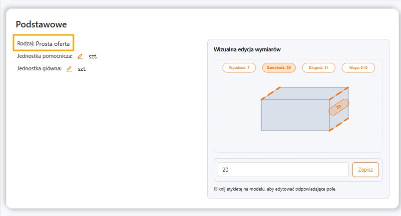 W tej sekcji możesz również sprawdzić i uzupełnić jednostkę główną oraz jednostkę pomocniczą. Obok znajdują się wymiary oferty: szerokość, wysokość, długość i waga.