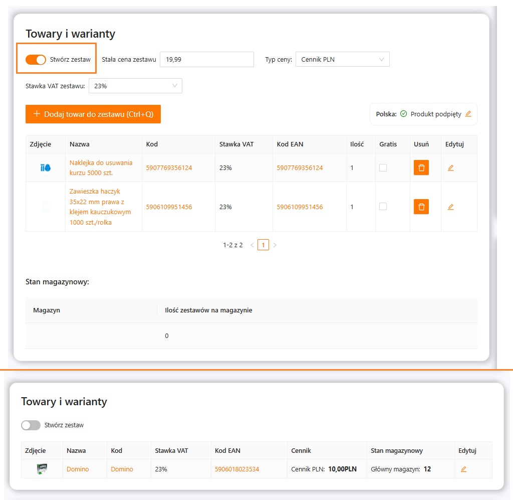 W zależności od typu oferty w tej części możesz zobaczyć także numer EAN. Dla ofert prostych i zestawów pole EAN jest dostępne bezpośrednio w nagłówku. Dla ofert wielowariantowych EAN-y są powiązane z poszczególnymi wariantami i są widoczne niżej, w sekcji Towary i warianty.
