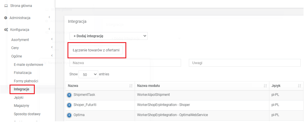Następnie przejdź do Konfiguracja → Ogólne → Integracje i wybierz przycisk Łączenie towarów z ofertami.