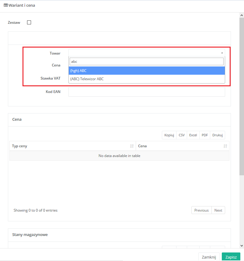 1. Wybierz towar w polu Towar (możesz szukać po nazwie, kodzie towaru lub EAN).
