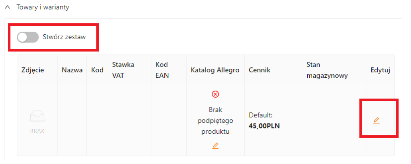 1. Otwórz edycję oferty, przejdź do sekcji Towary i warianty i kliknij ikonę ołówka.
