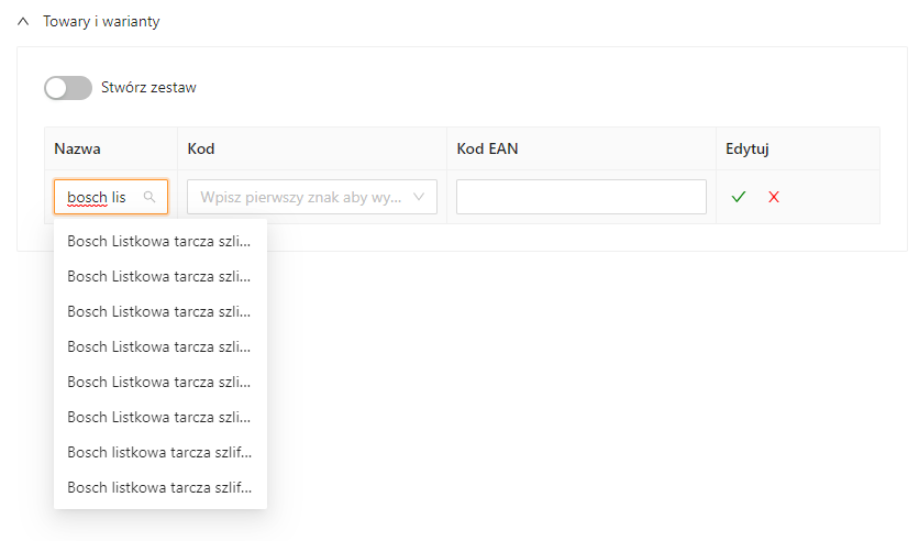 Jeśli chcesz przypisać do oferty kilka towarów, użyj opcji Stwórz zestaw. Szczegóły: Oferta jako zestaw.
