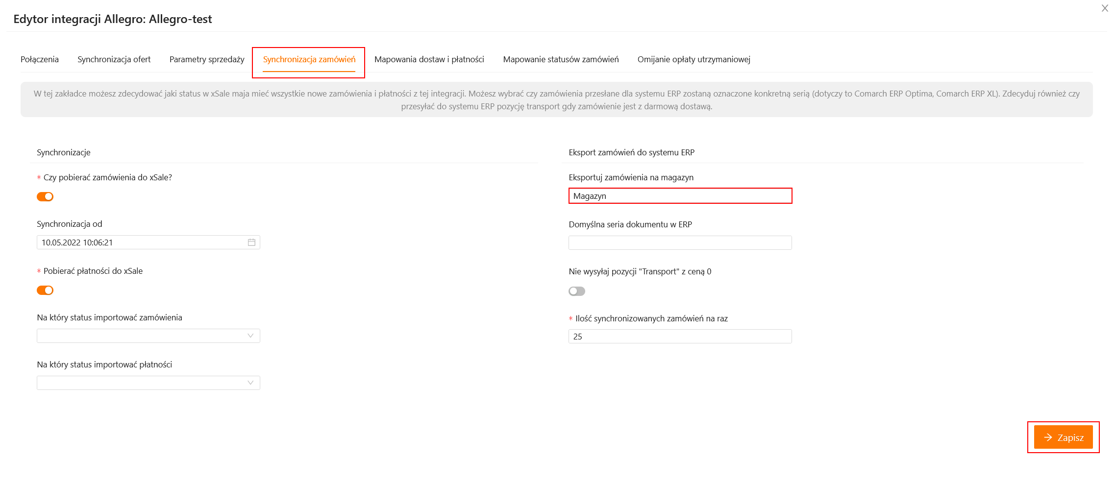 W widoku edycji integracji w polu Eksportuj dokumenty na magazyn wpisz kod magazynu w ERP, do którego xSale ma eksportować zamówienia. Następnie kliknij Zapisz.