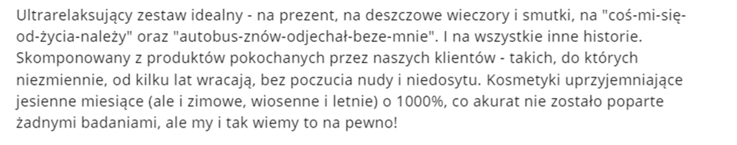 Ale wróćmy do kwestii języka. Jak wroga potraktuj długie, wielokrotnie złożone zdania – opis produktu nie powinien przybierać formy eseju. Najlepiej używaj języka w stronie czynnej, która dynamizuje cały tekst. Staraj się także nie korzystać z czasowników modalnych, jak „móc” czy „potrafić” (zamiast „może złagodzić” napisz: „złagodzi”) – przekaz z ich udziałem traci moc.