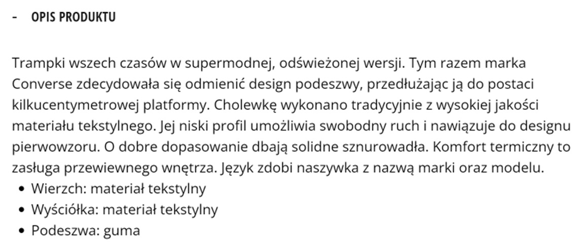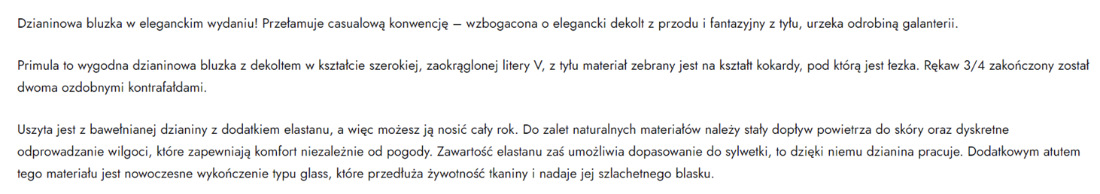 Sporo zależy także od grupy docelowej. Niebagatelne znaczenie ma również to, jak często zmieniają się produkty w Twoim sklepie oraz jak dużo ich jest. Nie bez powodu w dużych markach odzieżowych opisy są zwykle bardzo krótkie – trudno nadążyć jest w nich z przygotowywaniem dłuższych tekstów.
