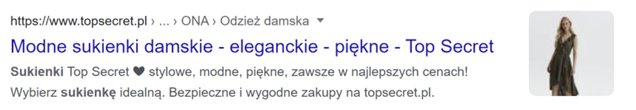 Meta title to tekst, który na poniższym, przykładowym obrazku oznaczony jest jako niebieski. Meta description to z kolei tekst znajdujący się tuż pod nim. Oba teksty wyświetlają się po wpisaniu odpowiednich słów kluczowych w wyszukiwarce Google.