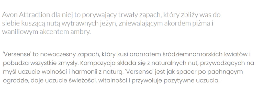 Warto się na nim skupić głównie w przypadku perfum i kosmetyków, ale również i samej żywności. Poniżej znajdziesz przykład dwóch takich opisów, pochodzących ze strony Wizaz.pl oraz Laneperfumy.pl.