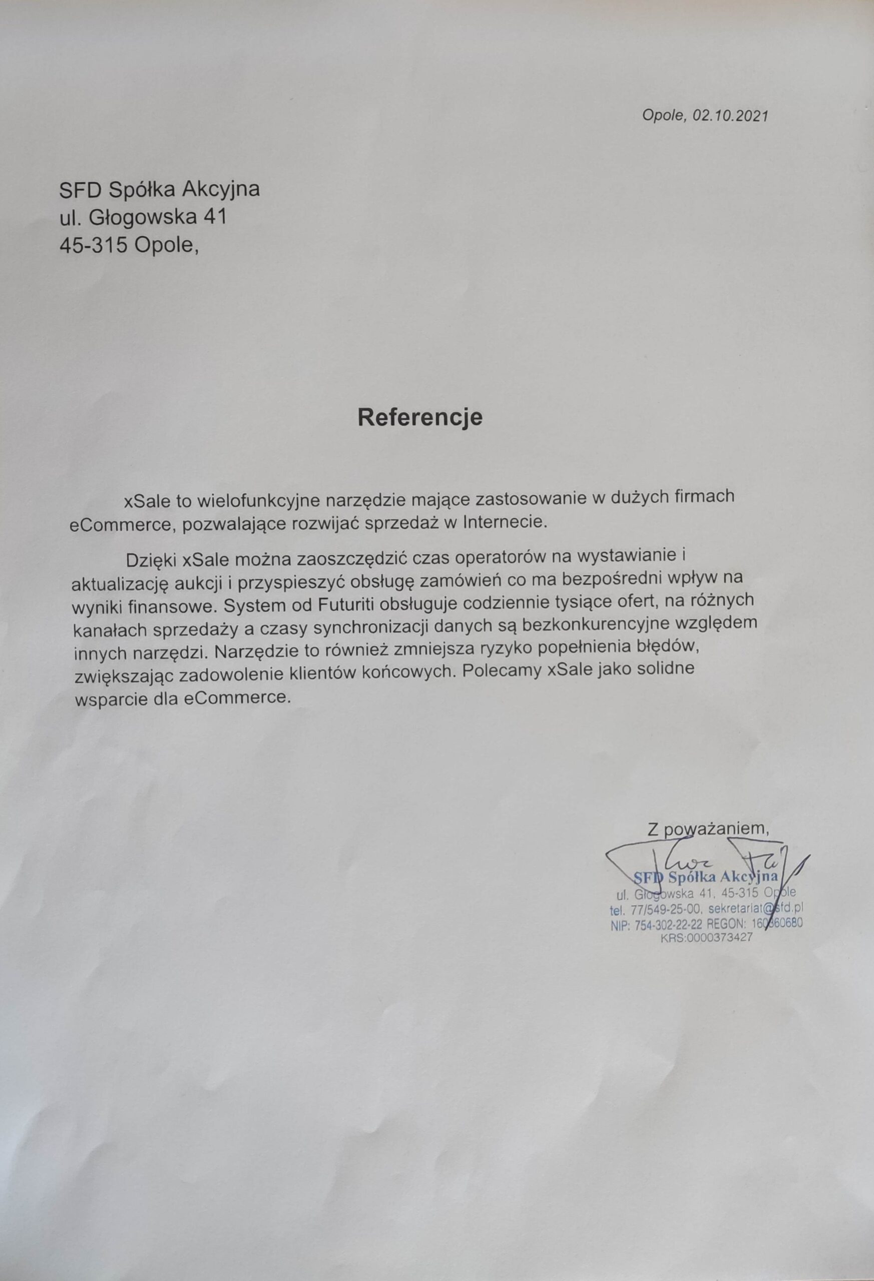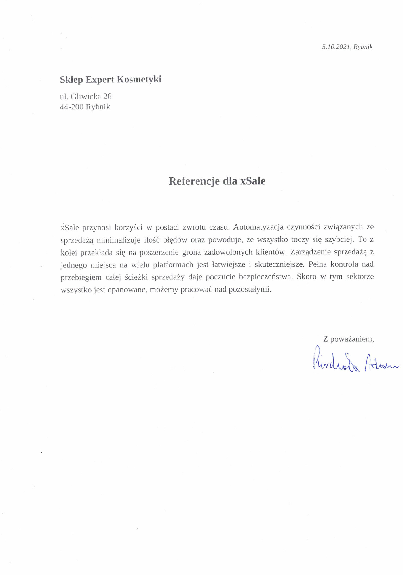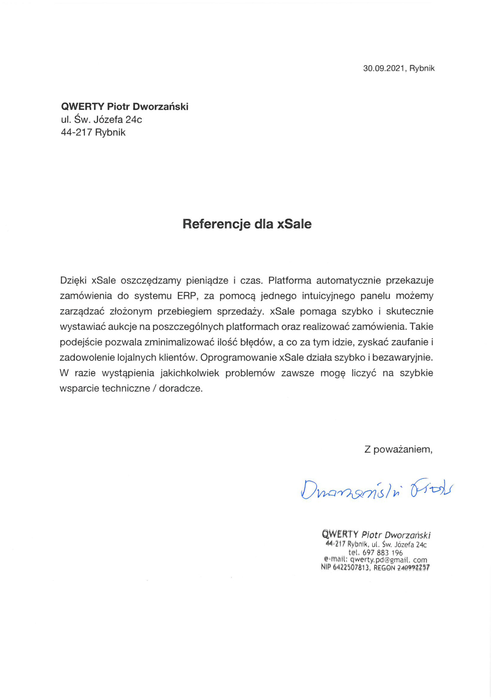 Sterowanie z jednego miejsca całą ofertą, wszystkimi produktami w różnych kanałach sprzedaży, skróciło wiele procesów w naszej organizacji. Dzięki xSale oszczędzamy pieniądze i czas. Platforma automatycznie przekazuje zamówienia do systemu ERP, za pomocą jednego intuicyjnego panelu możemy zarządzać złożonym przebiegiem sprzedaży. xSale pomaga szybko i skutecznie wystawiać aukcje na poszczególnych platformach oraz realizować zamówienia. Takie podejście pozwala zminimalizować ilość błędów, a co za tym idzie, zyskać zaufanie i zadowolenie lojalnych klientów.