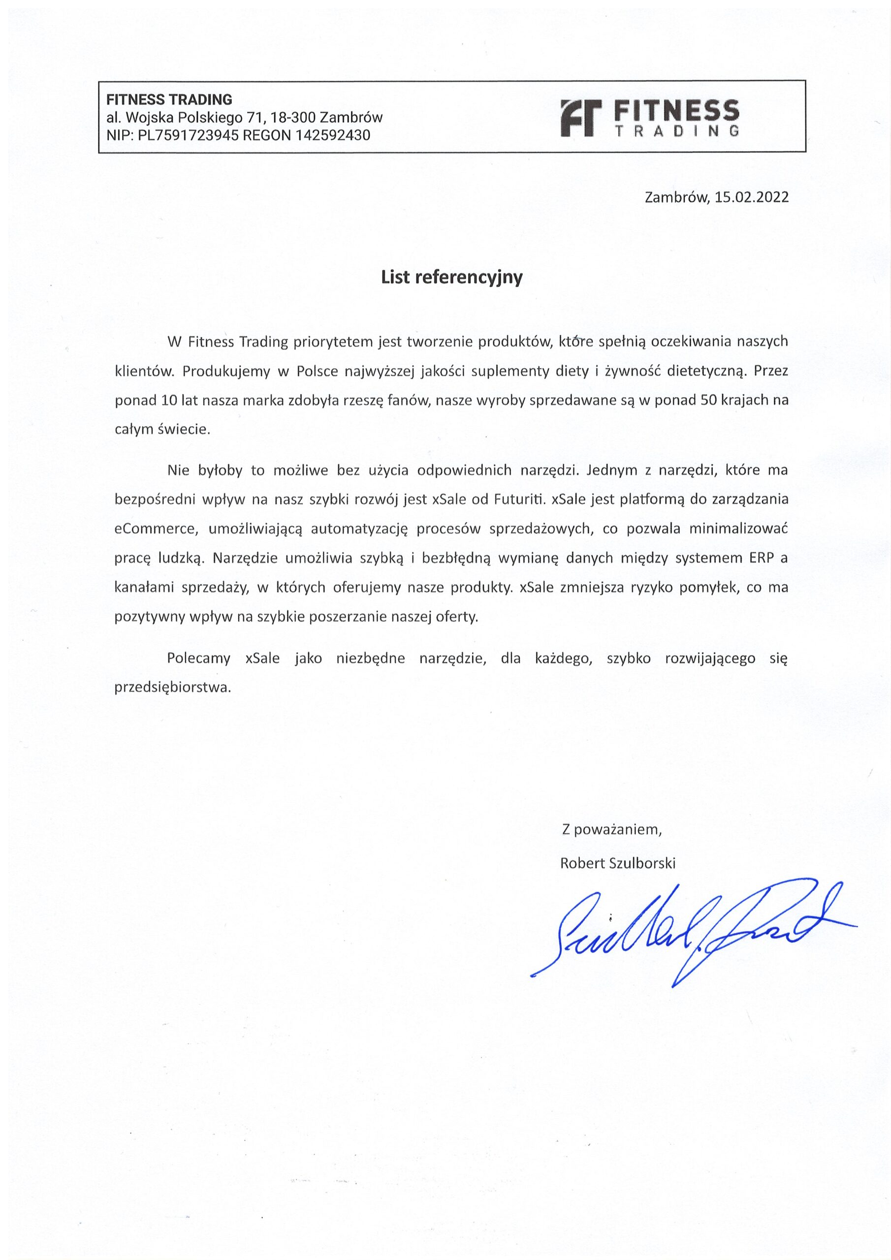 W Fitness Trading priorytetem jest tworzenie produktów, które spełnią oczekiwania naszych klientów. Produkujemy w Polsce najwyższej jakości suplementy diety i żywność dietetyczną. Przez ponad 10 lat nasza marka zdobyła rzeszę fanów, nasze wyroby sprzedawane są w ponad 50 krajach na całym świecie. Nie byłoby to możliwe bez użycia odpowiednich narzędzi. Jednym z narzędzi, które ma bezpośredni wpływ na nasz szybki rozwój jest xSale od Futuriti. xSale jest platformą do zarządzania eCommerce, umożliwiającą automatyzację procesów sprzedażowych, co pozwala minimalizować pracę ludzką. Narzędzie umożliwia szybką i bezbłędną wymianę danych między systemem ERP a kanałami sprzedaży, w których oferujemy nasze produkty. xSale zmniejsza ryzyko pomyłek, co ma pozytywny wpływ na szybkie poszerzanie naszej oferty. Polecamy xSale jako niezbędne narzędzie, dla każdego, szybko rozwijającego się przedsiębiorstwa.