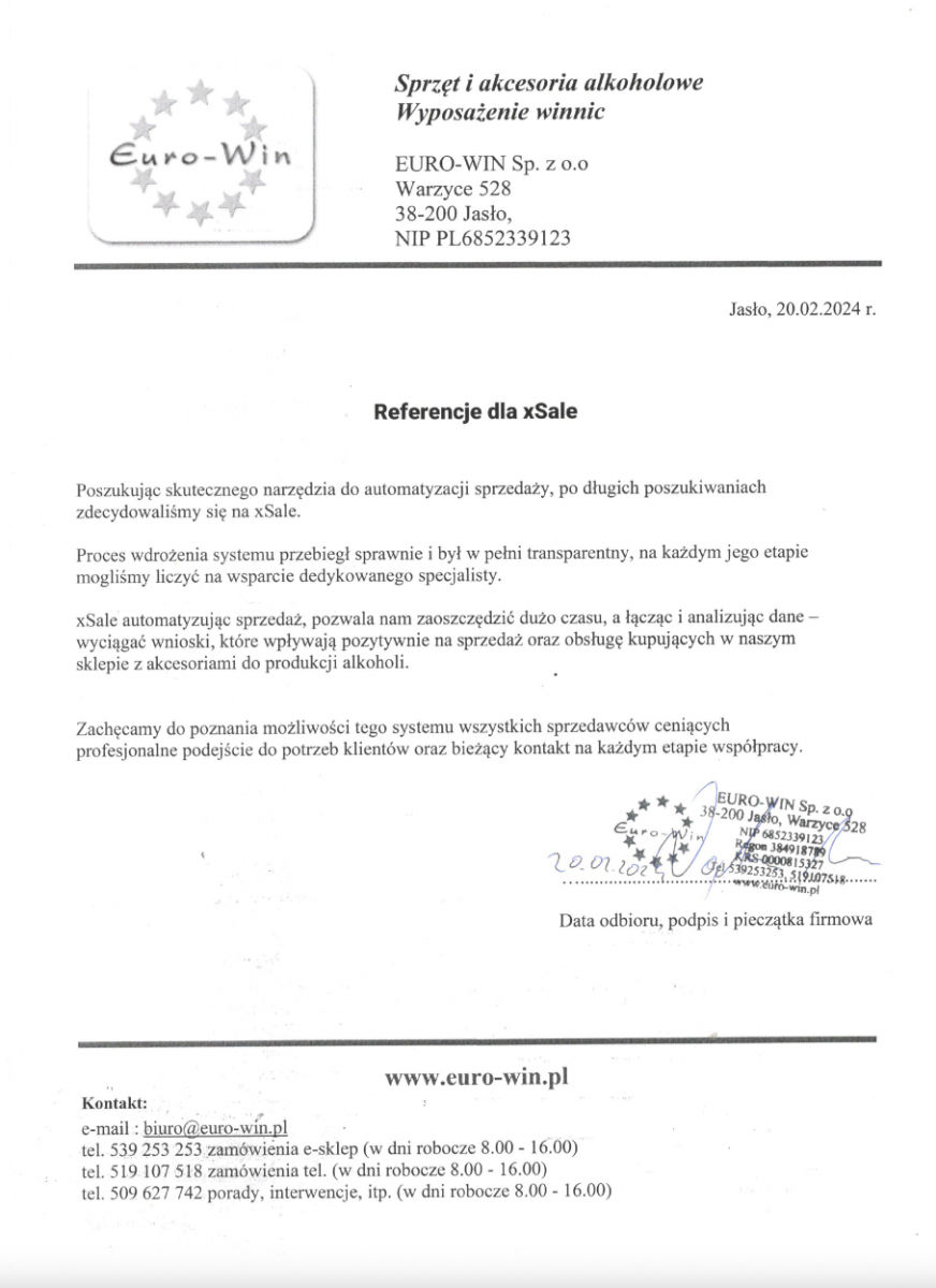 Poszukując skutecznego narzędzia do automatyzacji sprzedaży, po długich poszukiwaniach zdecydowaliśmy się na xSale. Proces wdrożenia systemu przebiegł sprawnie i był w pełni transparentny, na każdym jego etapie mogliśmy liczyć na wsparcie dedykowanego specjalisty. xSale automatyzując sprzedaż, pozwala nam zaoszczędzić dużo czasu, a łącząc i analizując dane — wyciągać wnioski, które wpływają pozytywnie na sprzedaż oraz obsługę kupujących w naszym sklepie z akcesoriami do produkcji alkoholi. Zachęcamy do poznania możliwości tego systemu wszystkich sprzedawców ceniących profesjonalne podejście do potrzeb klientów oraz bieżący kontakt na każdym etapie współpracy.